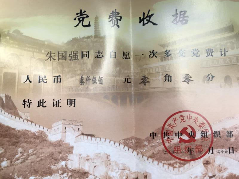 公司鉚焊車間員工、共產(chǎn)黨員朱國(guó)強(qiáng)同志,主動(dòng)將自己獲得"銅陵好人"榮譽(yù)的獎(jiǎng)勵(lì)金3500元,作為特殊黨費(fèi)上交,受到中央組織部的充分肯定和贊揚(yáng),并頒發(fā)特殊《黨費(fèi)收據(jù)》證書(shū)。