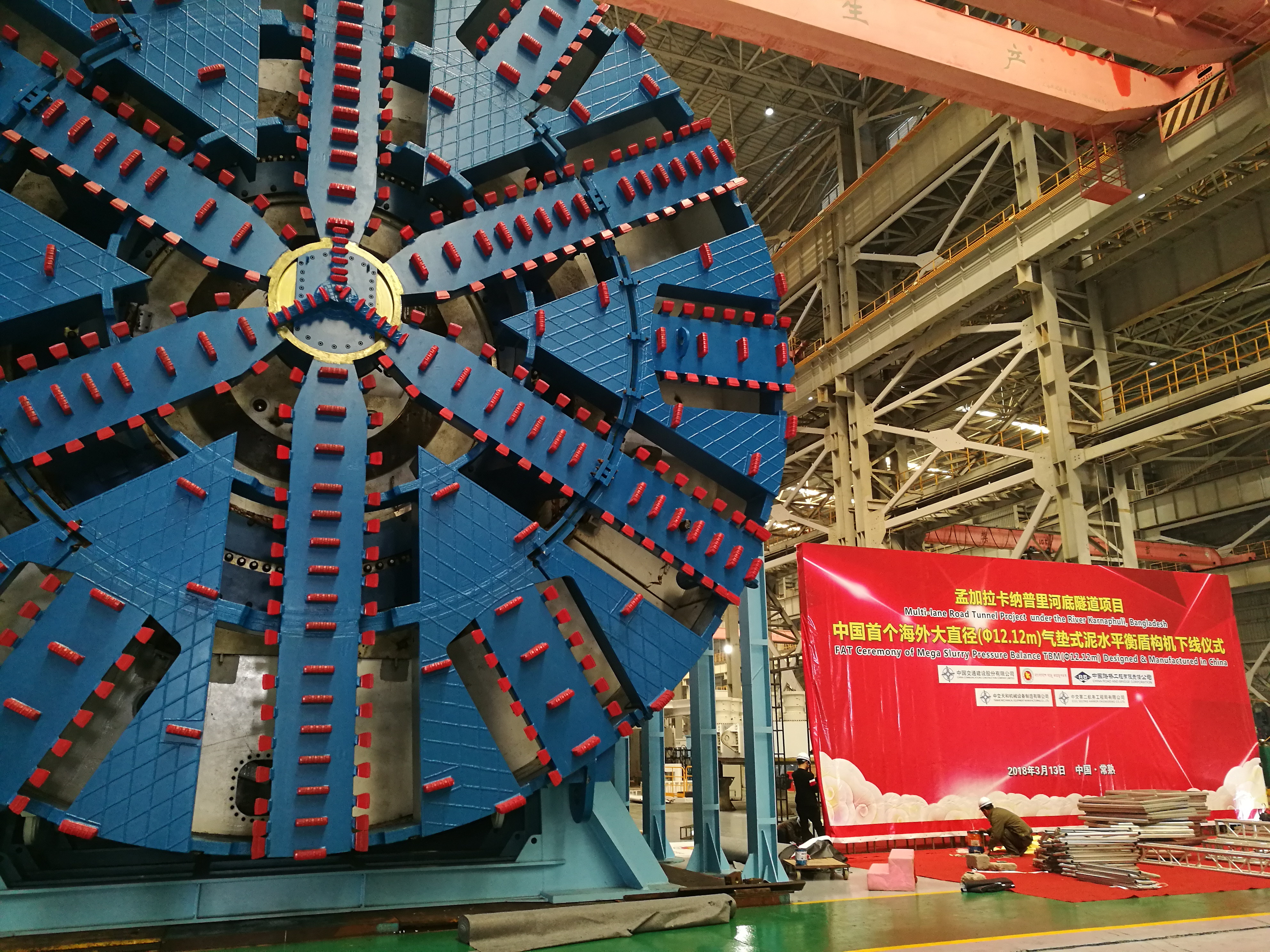 3月13日,由中交天和自主研制的中國出口海外大直徑盾構(gòu)機(jī)在江蘇常熟成功下線,盾構(gòu)機(jī)刀盤直徑達(dá)12.12米、長94米、重2200余噸,是南亞地區(qū)大直徑的盾構(gòu)機(jī)。該盾構(gòu)機(jī)將用于中國在海外大的盾構(gòu)公路隧道項(xiàng)目--孟加拉卡納普里河底隧道工程,打破了由發(fā)達(dá)國家對(duì)海外超大直徑盾構(gòu)市場(chǎng)的壟斷,標(biāo)志著中國盾構(gòu)機(jī)設(shè)計(jì)研發(fā)能力達(dá)到了領(lǐng)先水平。