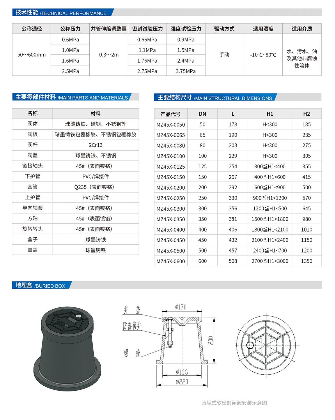 直埋式軟密封閘閥由閥門、地埋裝置(包括伸縮桿、伸縮護(hù)套、地埋盒)等部分組成。其閥門部分除了具有軟密封閘閥的所有特點(diǎn)之外,還具備先進(jìn)的烤漆層防腐技術(shù),閥體不會(huì)生銹,確保三十年免維護(hù)。由于軟密封閘閥使用壽命長(zhǎng),性能穩(wěn)定,在軟密封閘閥基礎(chǔ)上添加了一個(gè)伸縮桿、伸縮護(hù)套,并配以地埋盒,形成直埋式軟密封閘閥,特點(diǎn)如下: